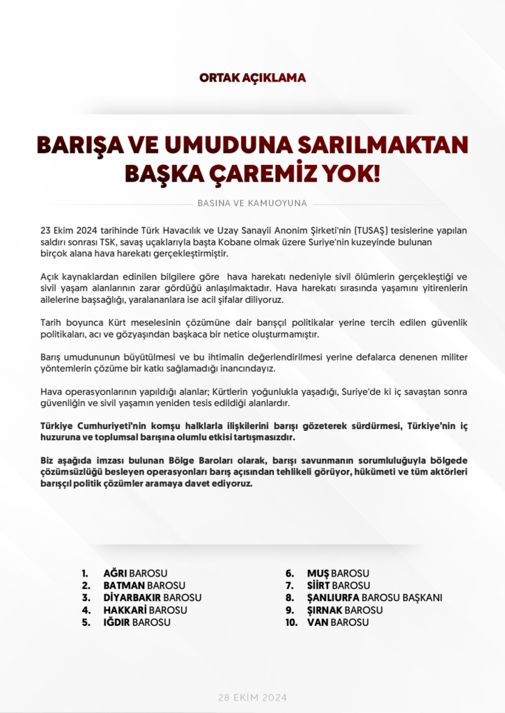23 Ekim 2024 tarihinde Türk Havacılık ve Uzay Sanayii Anonim Şirketi’nin (TUSAŞ) tesislerine yönelik gerçekleştirilen saldırının ardından, Türk Silahlı Kuvvetleri (TSK) tarafından Suriye’nin kuzeyinde başta Kobane olmak üzere çeşitli alanlara hava harekatı düzenlendi. Bölge baroları, bu harekat sonrası yaşanan sivil kayıplara ve zarar gören sivil yaşam alanlarına dikkat çekerek, savaş yerine barışçıl çözümlerin benimsenmesi gerektiği konusunda ortak bir açıklama yaptı.