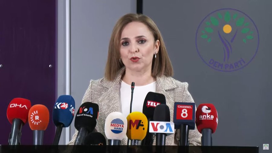 Halkların Eşitlik ve Demokrasi Partisi (DEM Parti) Sözcüsü Ayşegül Doğan ve Hukuk Komisyonu Eş Sözcüsü Öztürk Türkdoğan, Van Büyükşehir Belediyesi Eşbaşkanı Abdullah Zeydan’ın memnu hakkının Adalet Bakanlığı’nın ‘talimatıyla’ geri alınmasına ilişkin parti genel merkezinde açıklama yaptı.