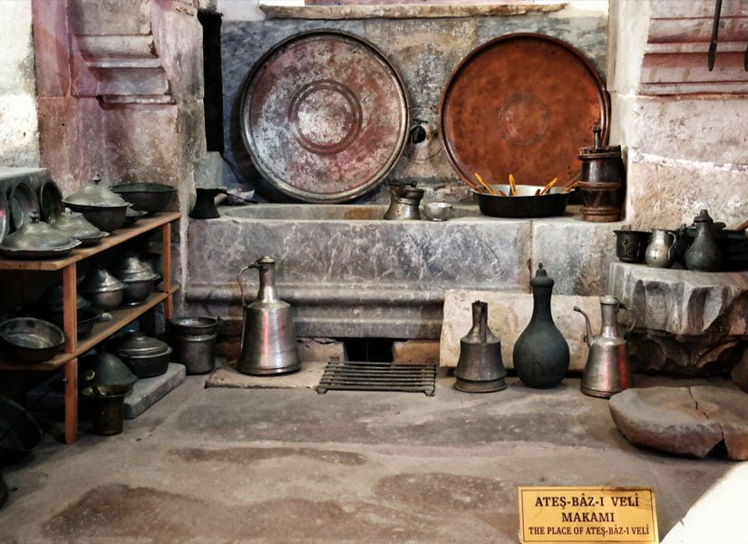 Mevlevilikte mutfak, Matbah-ı Şerif olarak adlandırılır. Matbah-ı Şerif’te yemek, yer sofrası olarak bilinen somatlarda yenilirdi. Mevlevi mutfağında mutfaktan sorumlu kişi ise Ateşbaz-ı Veli yani gerçek ismiyle Şemseddin Yusuf’tur. Ateşbaz-ı Veli, ateşle oynayan anlamına gelmekte ve ayrıca mutfak sorumlusu olduğundan “Aşçı dede” olarak da bilinmektedir. Aşçı dede tüm mutfaktan sorumlu olup bunun yanında; Şerbetçi, şerbet ikram eden kişi, Somatçı sofrayı hazırlayan kişi, İçeri Meydancısı kahve ikram eden kişi, Dışarı Meydancısı emirleri ileten kişi, Pazarcı mutfak alışverişini yapan kişi, Kazancı Dede, Aşçı dedenin yardımcısı ve mutfaktan sorumlu kişi Halife Dede Mutfağa yeni gelenlere yol gösteren kişidir.